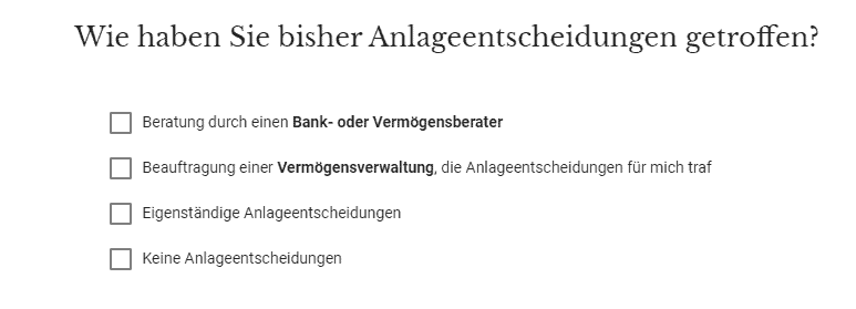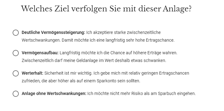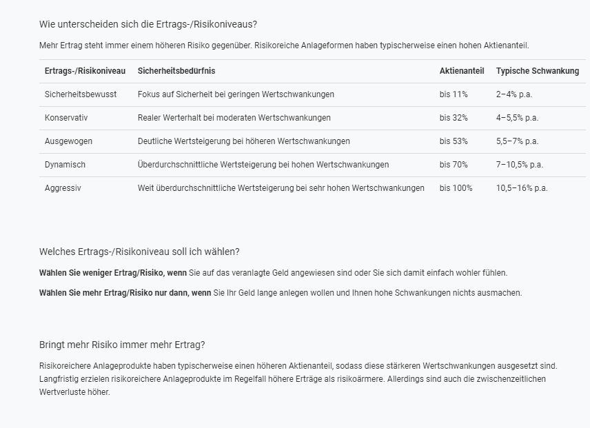 Je nach Ertrags-/Risikokategorie befinden sich Aktien, Anleihen, Gold und Geldbestände im Portfolio. Die Mindesteinlage beträgt 10.000 Euro. Ein Sparplan ist ab 100 Euro monatlich möglich und wird am 5. des Monats durchgeführt.