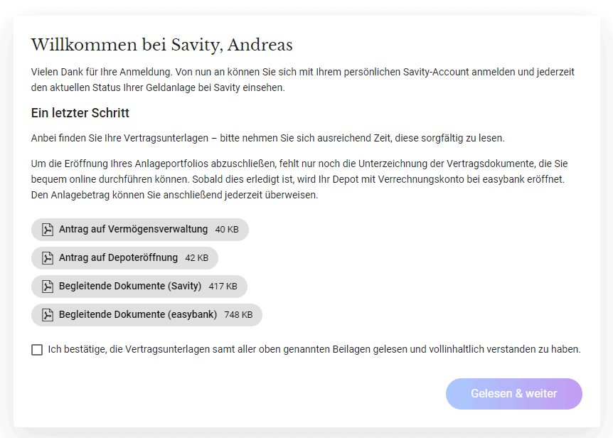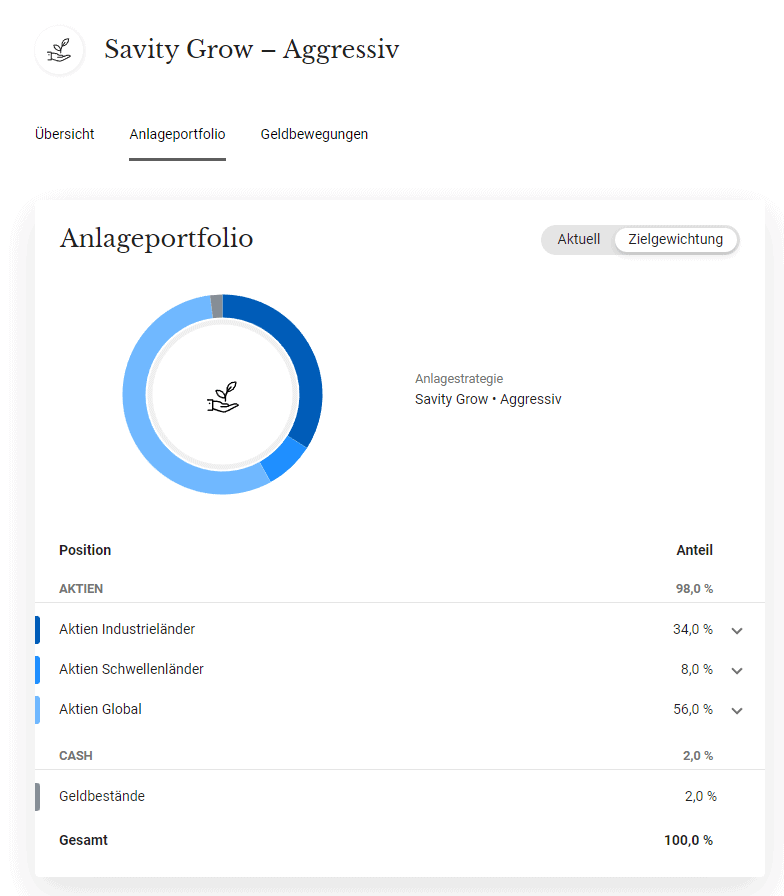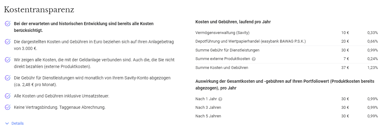 Zusätzlich zu den Gebühren von Savity kommen allerdings noch die Produktkosten der jeweiligen Fonds- bzw. ETF-Anbieter. Diese hängen vom gewählten Portfolio ab, sind in den Wertpapierkursen bereits enthalten und werden nicht separat verrechnet.