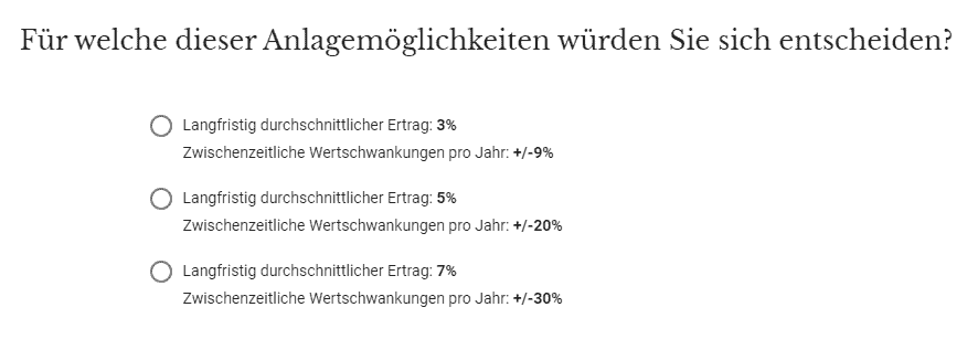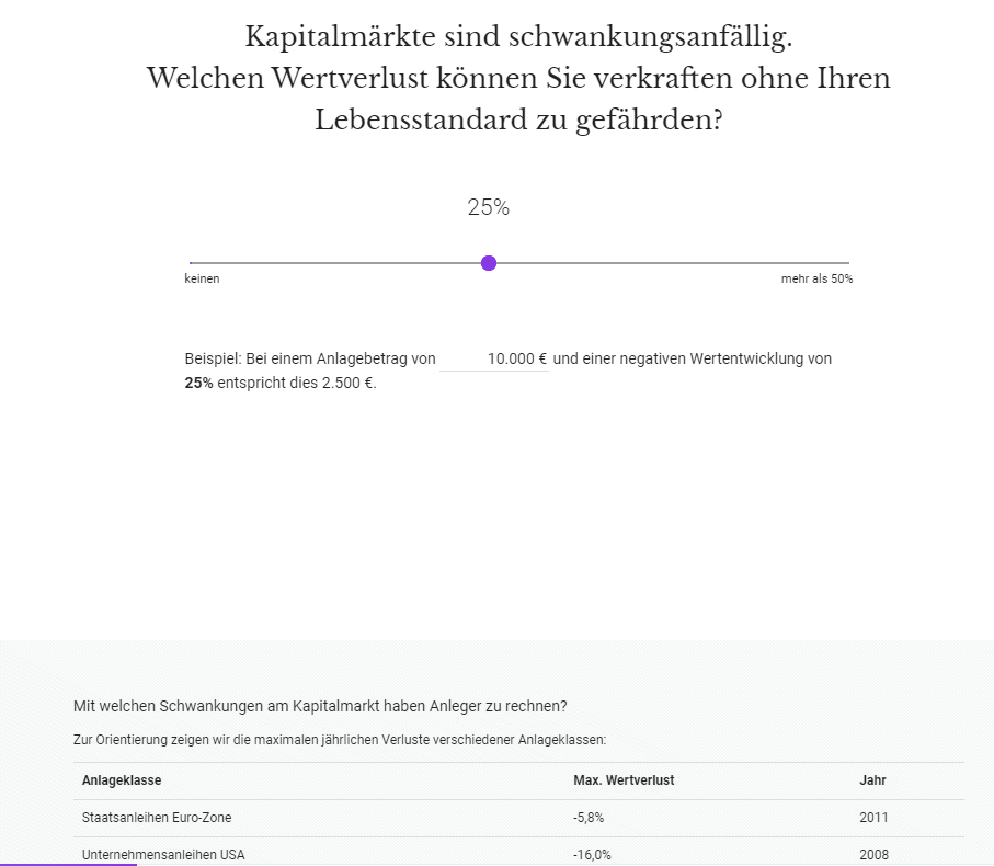 Diese Kennziffer bezieht sich auf das Verlustrisiko. Sie gibt vor, aufgrund welcher Wahrscheinlichkeit das Investment für welche Dauer einen Verlust aufweist. Sie gibt dem Anleger einen Hinweis darauf, mit welchem Risiko er unter Berücksichtigung der Prämissen rechnen muss. Dieser Ansatz ist bei der Risikobeurteilung sinnvoller, als der reine Hinweis auf die Aktienquote.