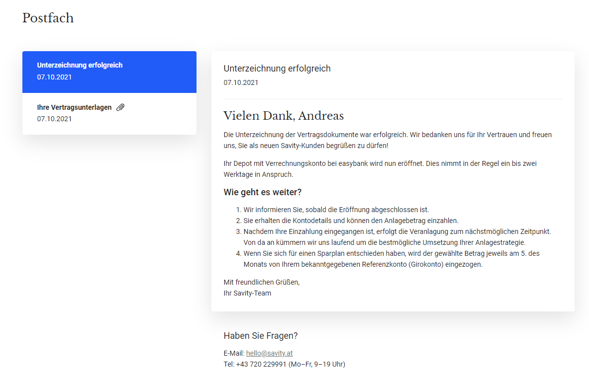 Zum einen öffnet sich über den Hilfe-Button ein E-Mail-Kontaktformular. Wem dies zu langwierig ist, kann das Unternehmen auch unter der Rufnummer +43 720 229991 erreichen. Der Kundendienst ist von Montag bis Freitag in der Zeit zwischen 9:00 Uhr und 19:00 Uhr erreichbar. Die E-Mail-Adresse lautet hello@savity.at.