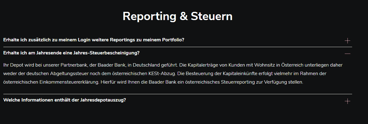 | Steuereinfach: | Nein, aber Steuerreporting inklusive Ausfüllhilfe durch Partnerbank Baader Bank |