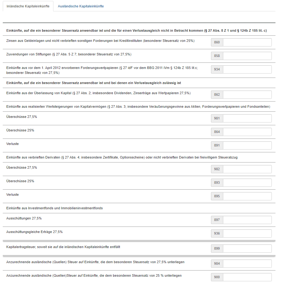- Wenn Einkünfte aus Kapitalvermögen bezogen worden sind, die dem besonderen Steuersatz von 27,5 Prozent, aber nicht der KESt (Kapitalertragsteuer) unterliegen (insbesondere ausländische Kapitaleinkünfte)