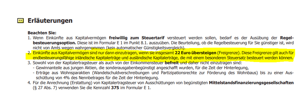 ich habe beim E1kV Formular gelesen, dass es sehr wohl einen Freibetrag für ausländische Kapitalerträge von 22€ gibt (Siehe Screenshot). Also muss ich unter dieser Grenze meine Kapitalerträge unter dieser Grenze nicht in der Einkommenssteuererklärung abgeben? Vielleicht weißt du dazu mehr.