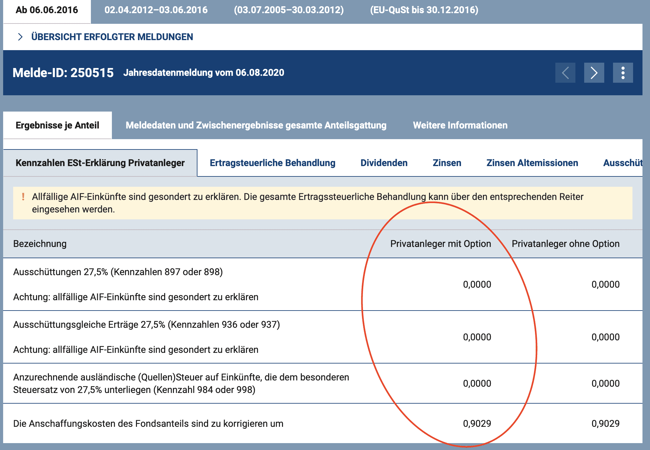 Achtung: Wie auch my.oekb.at darauf hinweist, sind allfällige AIF-Einkünfte gesondert zu erklären. Dies kann überprüft werden über den Reiter „Ertragssteuerliche Behandlung“ ob welche vorliegen. Dieser Punkt „13 Steuerpflichtige AIF Einkünfte“ wird vermutlich in den meisten Fällen leer sein.