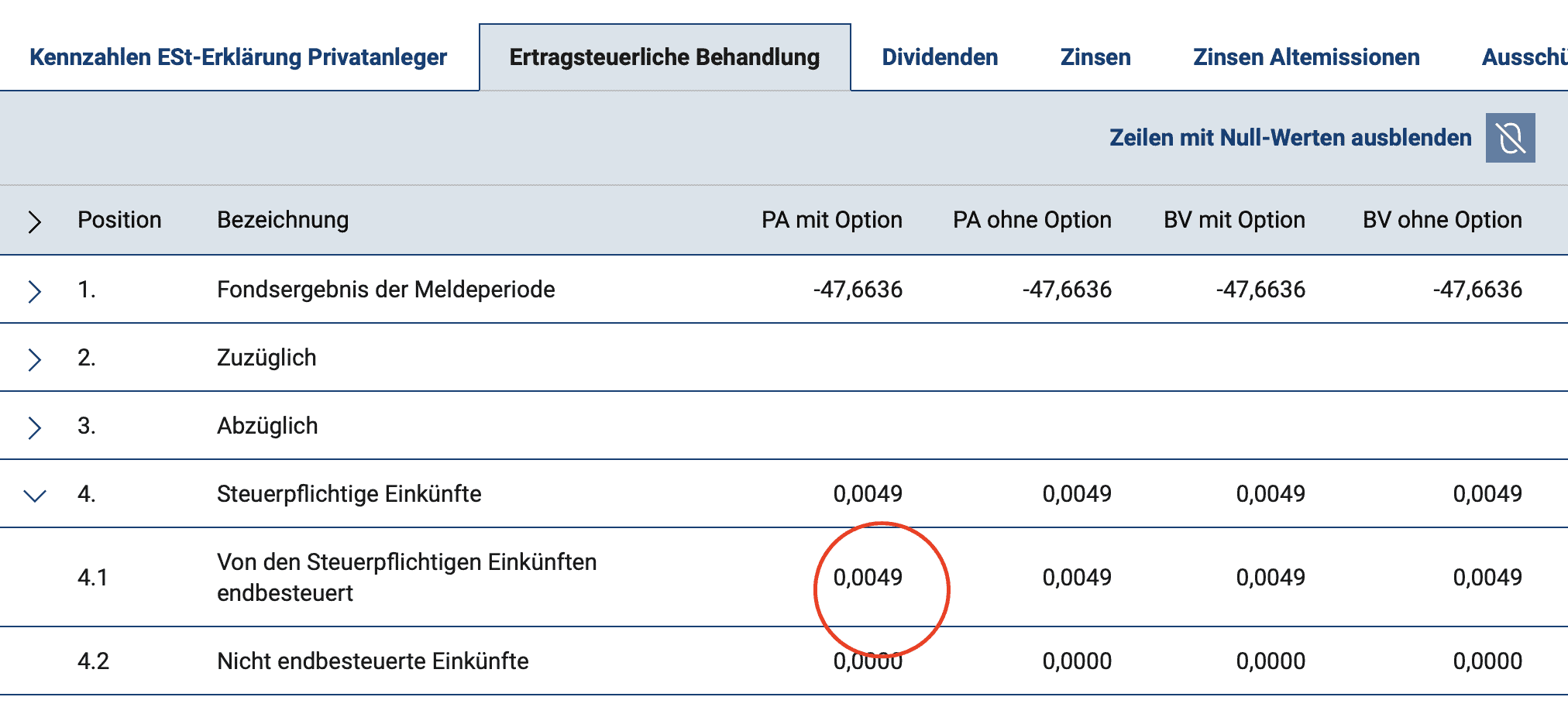 Es könnte auch der Fall sein, dass die Fonds von inländischen Depots freiwillig veranlagt werden, z. B. für einen depotübergreifenden Verlustausgleich. Dafür sind dann die Zahlen 897 bzw. 936 der linken Spalten heranzuziehen.