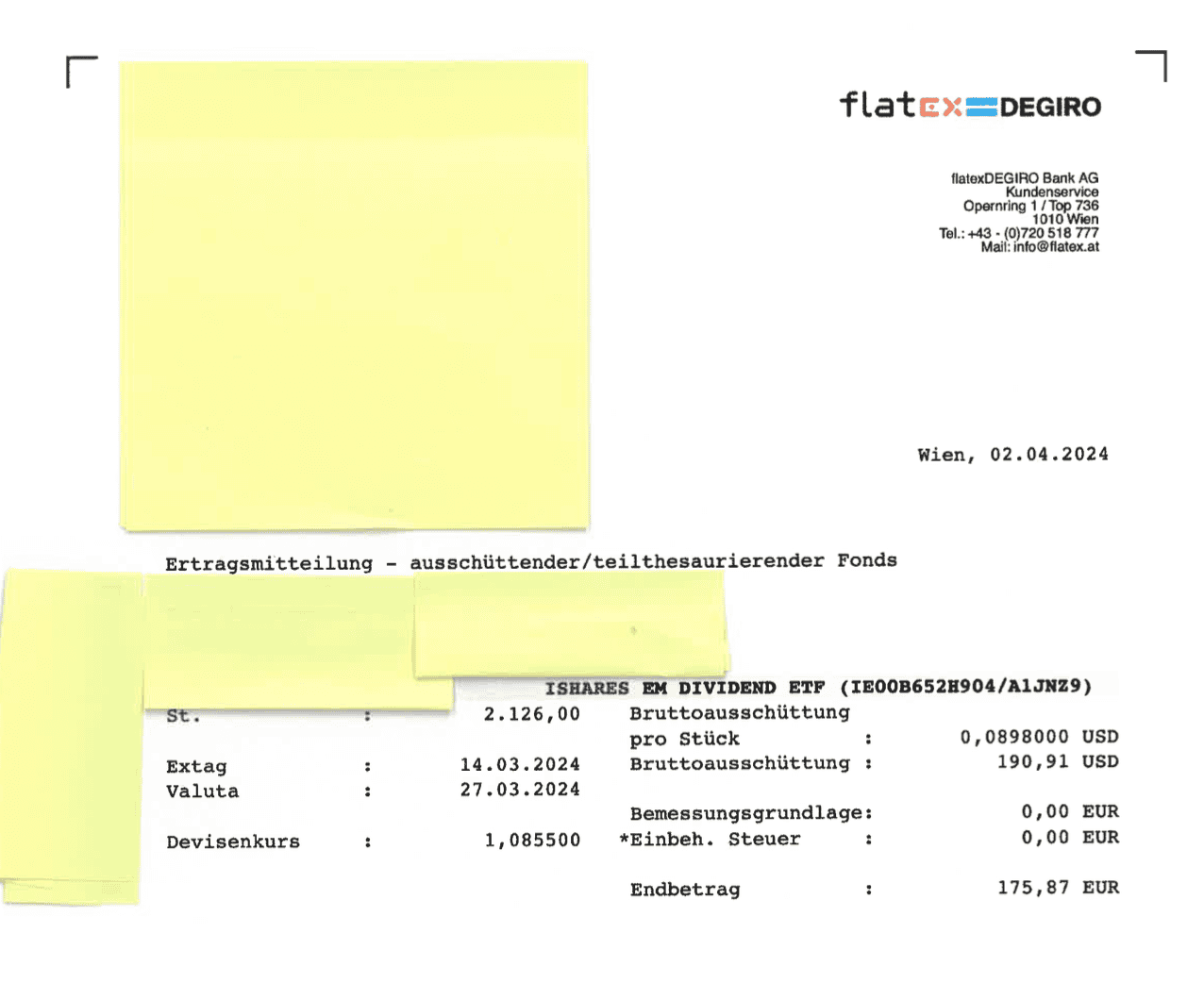 Die Meldungen an die OEKB wurden vorgenommen, wie du mir gezeigt hast, aber flatex hat mir keine KEST einbehalten. Auf der beigefügten Abrechnung von flatex sollte doch unter einbehaltener Steuer 27,5 % KEST von der Ausschüttung stehen oder verstehe ich das falsch?