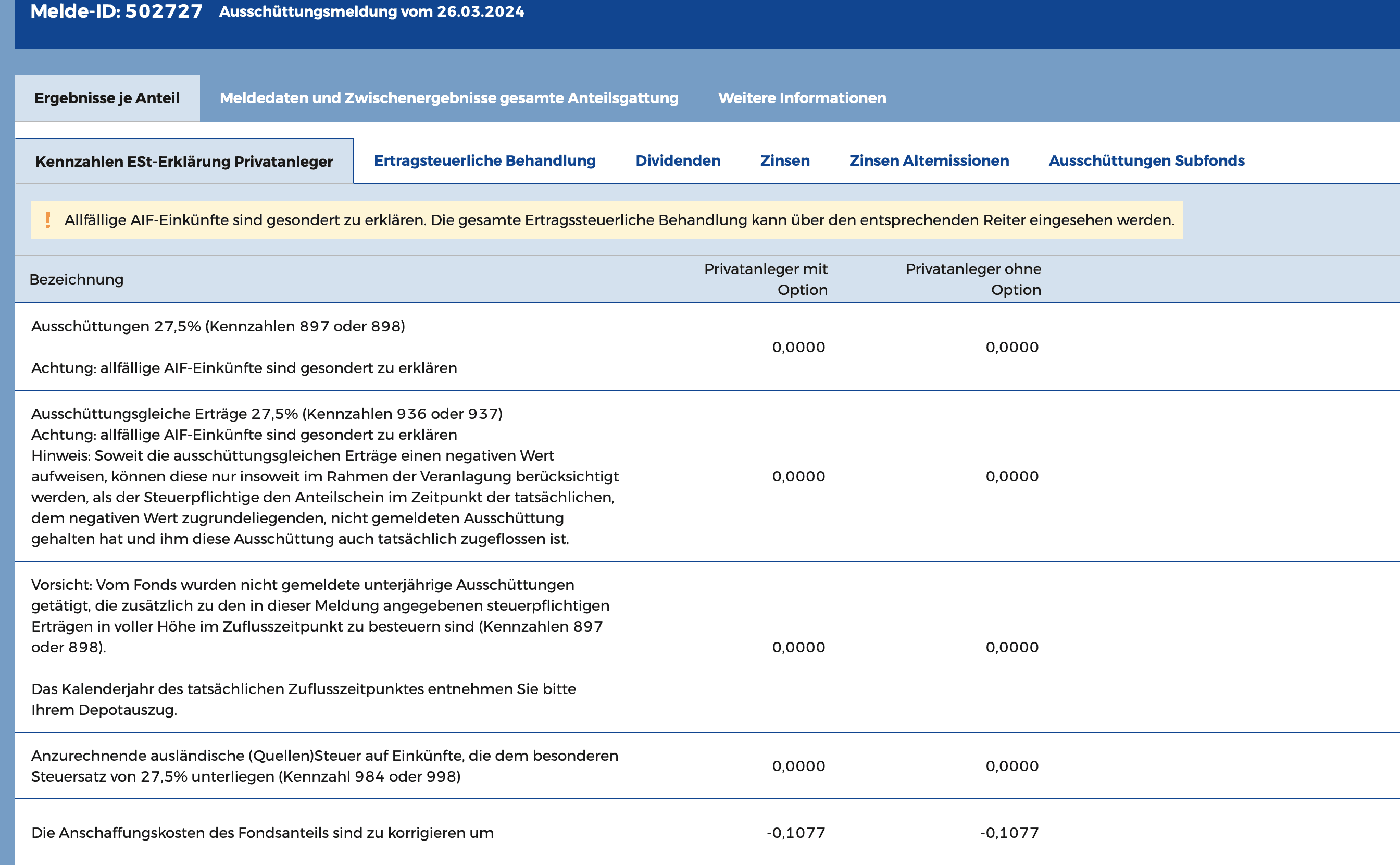 ad 2) die Jahresmeldung ist leer, bei den Ausschüttungen, ausschüttungsgleichen Erträgen, Quellensteuern etc. nur die Anschaffungskosten sind leicht zu korrigieren 0,0006 der Fondswährung.