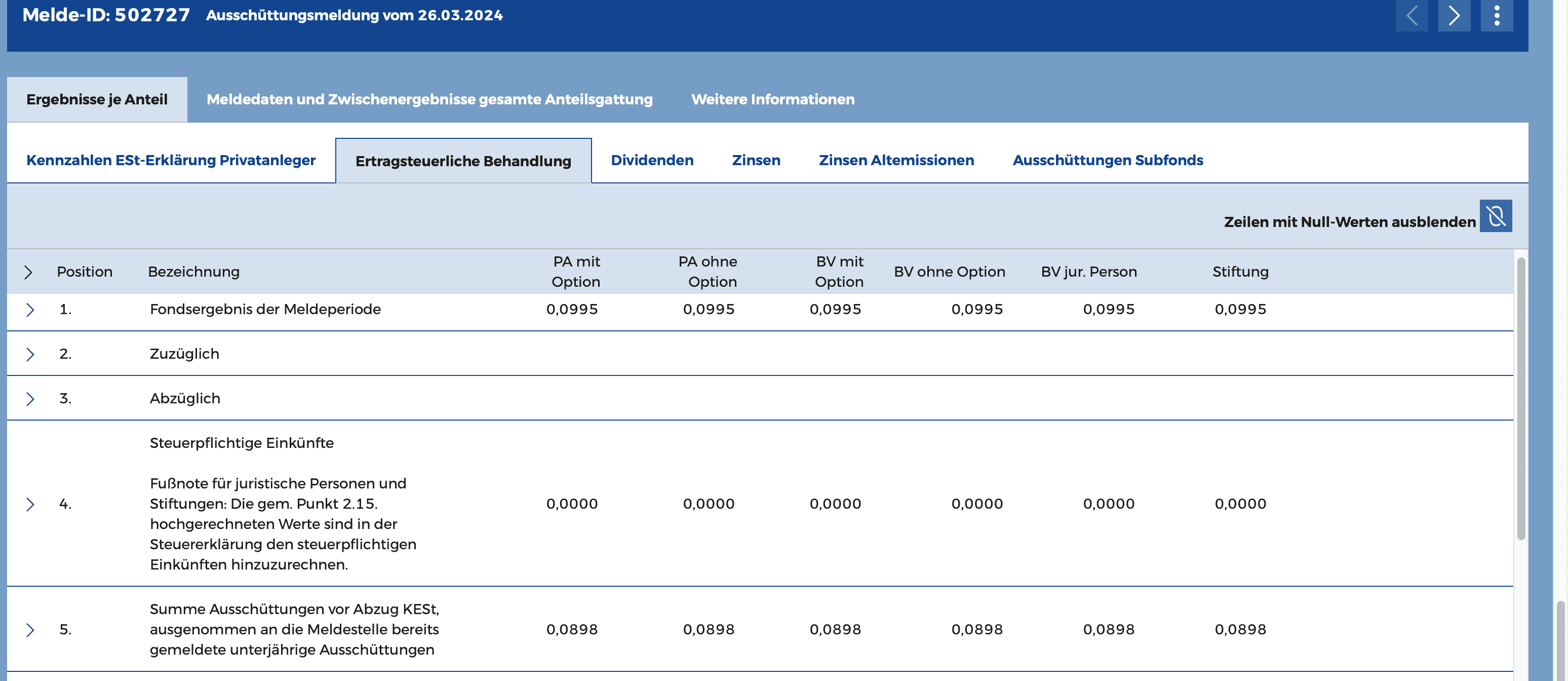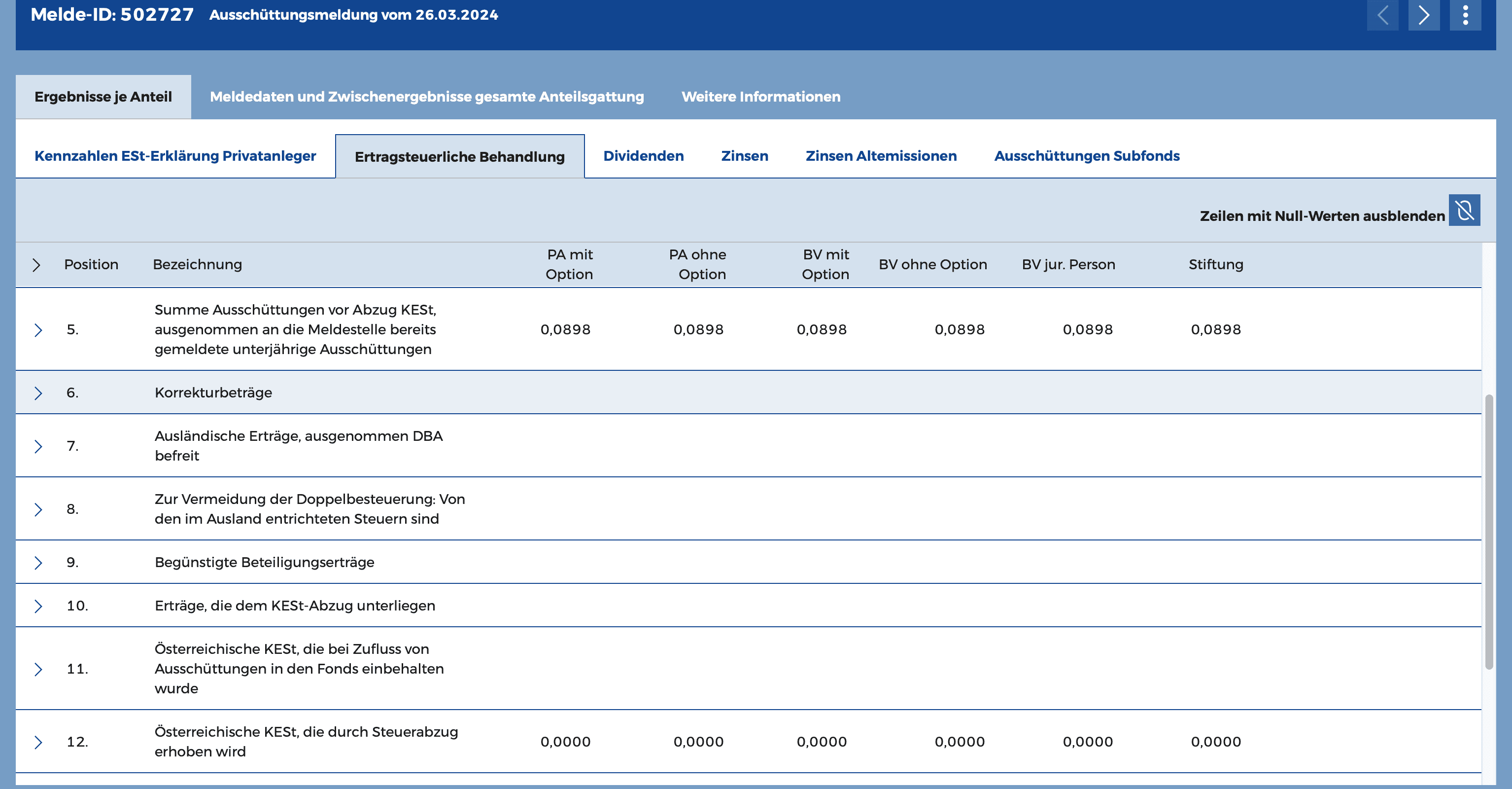 1. Ich glaube, dass die Ausschüttungen nicht gemeldet werden, weil auf der OEKB Seite bei „Ausschüttungsmeldung“ ein Nein steht.