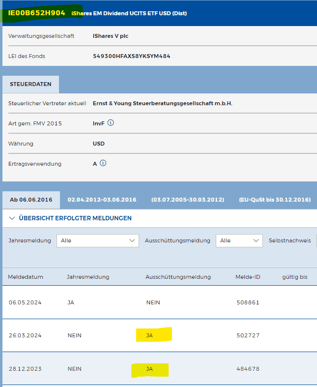 Die ISIN stimmt. Du hast recht mit den Ausschüttungsmeldungen. Ich hab die ganze Zeit die falsche Seite betrachtet, nämlich die, die nur die Jahresmeldungen zeigt. Danke, jetzt weiß ich wo ich die richtige Info finde.