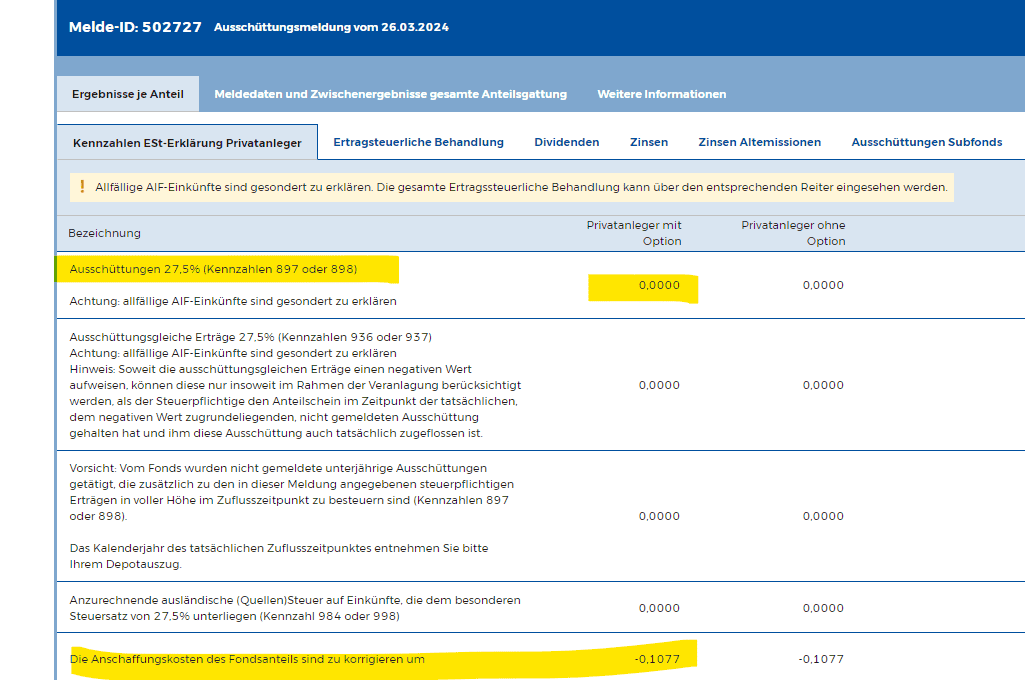 und das ist es auch – du siehst, dass keine Ausschüttung gemeldet wurde und so der Broker hier auch nichts abzuziehen hat. Gleichzeitig wird der Broker darüber informiert, dass die Anschaffungskosten um -0,1077 reduziert werden müssen.